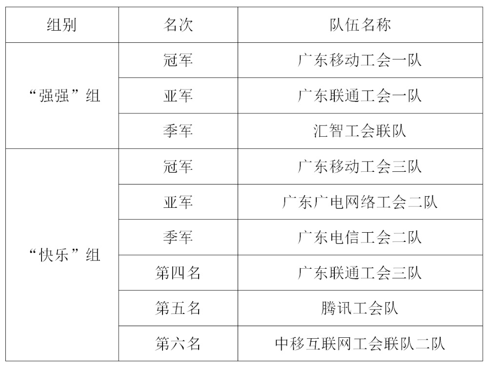 比赛现场气氛热烈,选手们以精湛的球技和顽强的拼搏精神为观众奉献了一场场精彩对决。在“强强”组的比赛中,广东移动工会一队凭借出色的团队配合和稳定的发挥成功斩获冠军。广东联通工会一队和汇智工会联队分获亚军和季军,他们的精彩表现赢得了现场观众的阵阵喝彩。“快乐”组的角逐同样激烈,广东移动工会三队摘得桂冠,广东广电网络工会二队和广东电信工会二队分列二、三名。