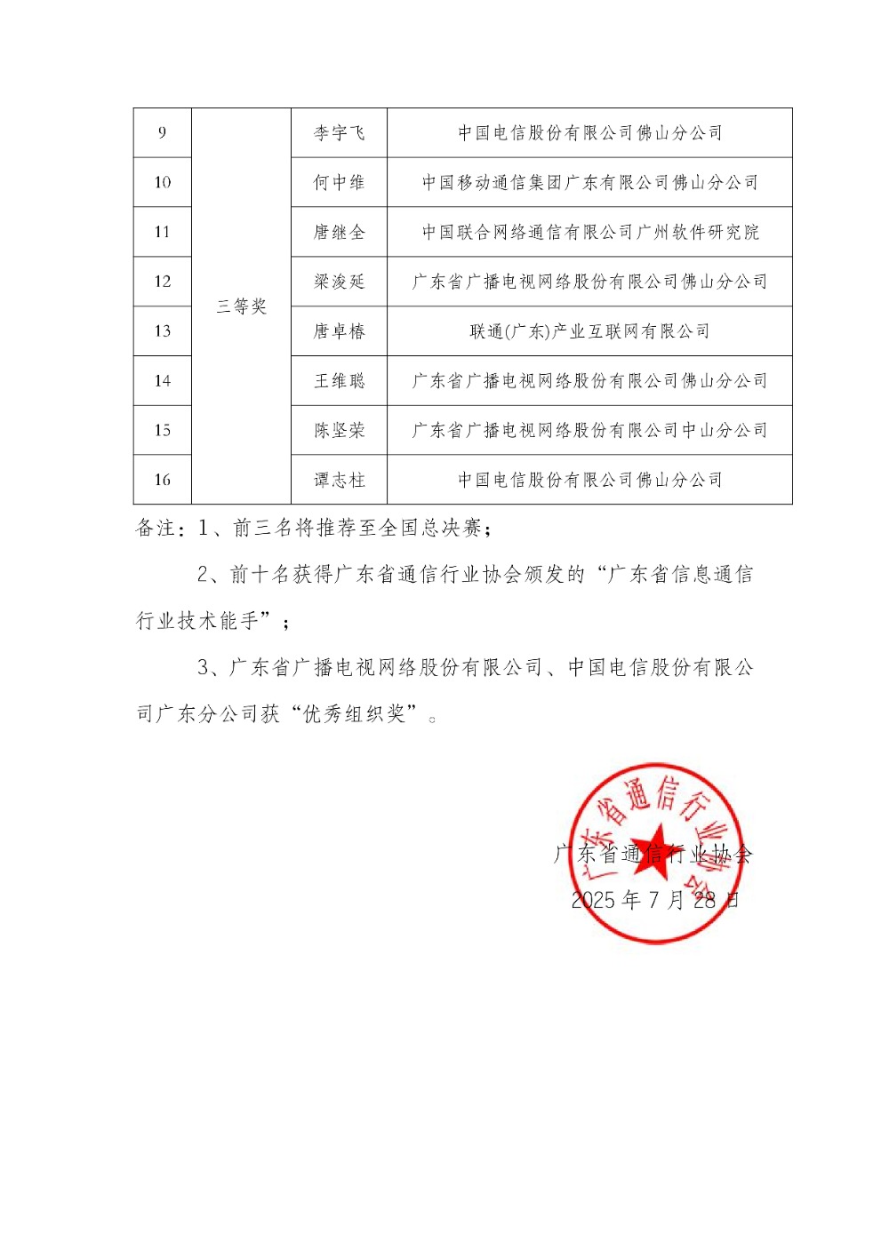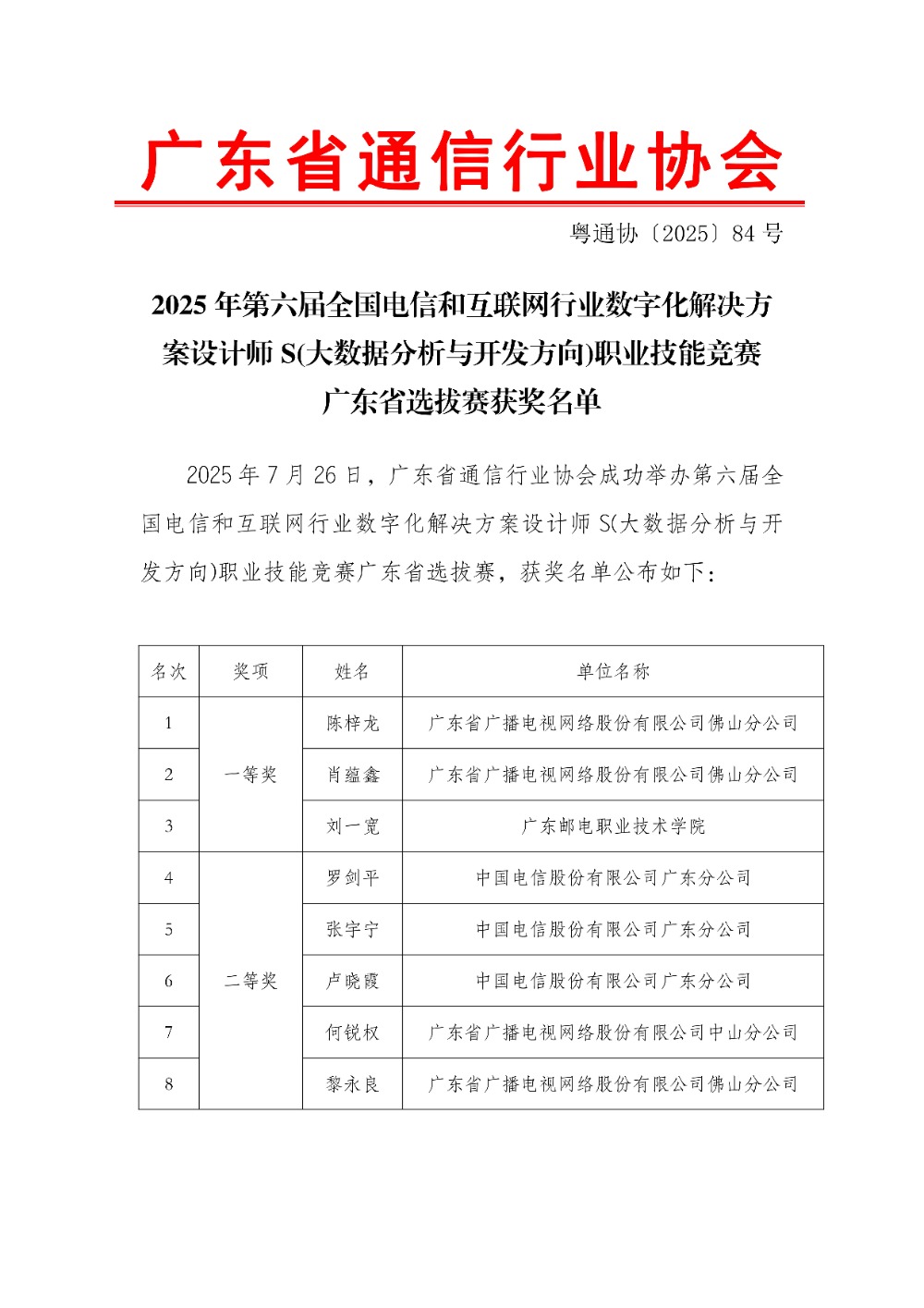 粤通协【2025】84号 2025年第六届全国电信和互联网行业数字化解决方案设计师S(大数据分析与开发方向)职业技能竞赛广东省选拔赛获奖名单
