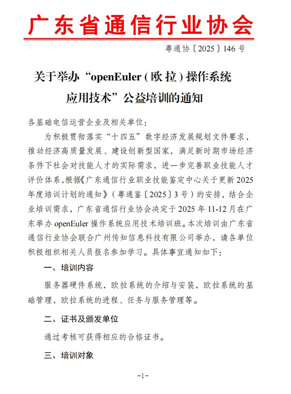 粤通协【2025】146 号-关于举办“ openEuler ( 欧 拉 ) 操作系统 应用技术”公益培训的通知