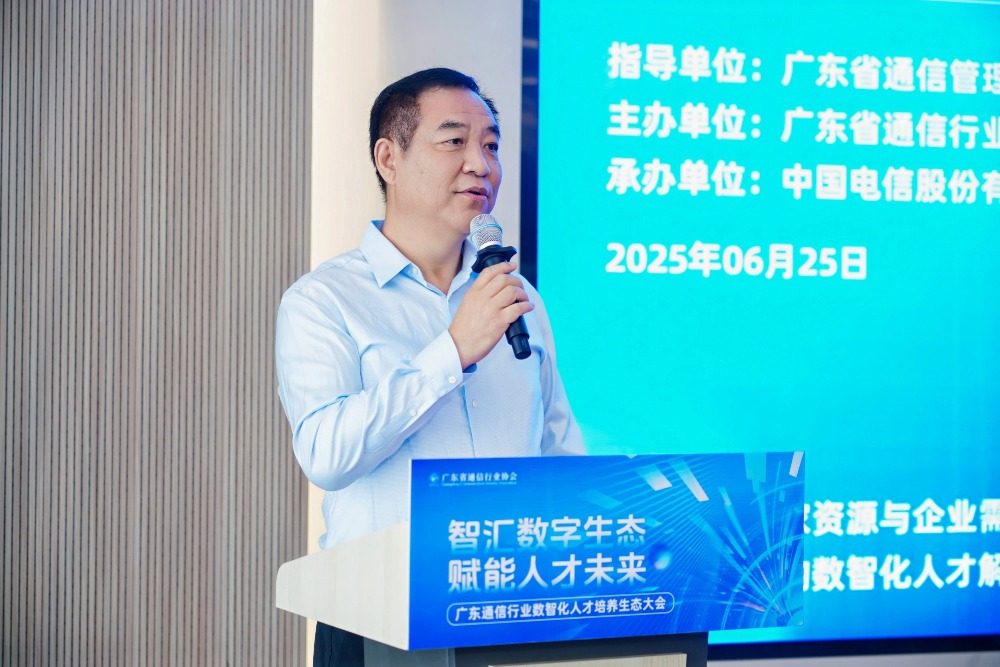 中国电信广东公司总经理张涛以企业实践为切入点,展示了中国电信“技术-产业-人才”闭环生态建设成果。人才是第一资源,广东电信实施人才强企工程,每年通过校招、社招引进约1000名科技型人才,训战结合培养近2000名骨干人才,全省认证近3万人,同时以科技创新引领数字基础设施建设,如建设韶关万卡全液冷智算中心等,还赋能千行百业,如支撑深圳“民意速办”平台、自主研发低空运行管理平台等,但人才储备仍有不足。广东电信作为人才专委会的主任单位,将在省通信管理局和通信行业协会的领导下,团结和组织各会员单位,培养高水平的信息通信产业人才,服务广东高质量发展大局。